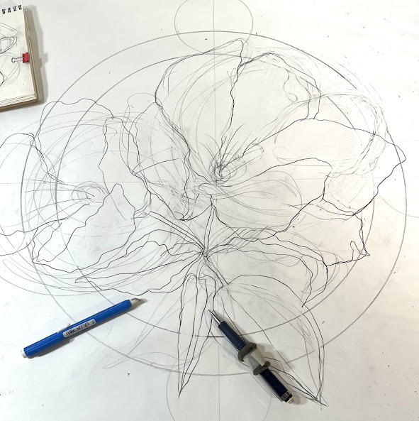 Below is that sketch translated onto the full scale 30"x30". Again, it may appear a bit chaotic but a path is being forged that will lead to the finished drawing. Lots of back and forth, lots of erasing, lots of looking and feeling my way along. But happy to be there right now.